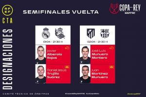 体育资讯03月31日讯 西班牙足协公布了国王杯半决赛次回合的裁判名单。首回合,皇马1-0皇家社会,巴萨4-4马竞。次回合的比赛将于本周三和周四进行。